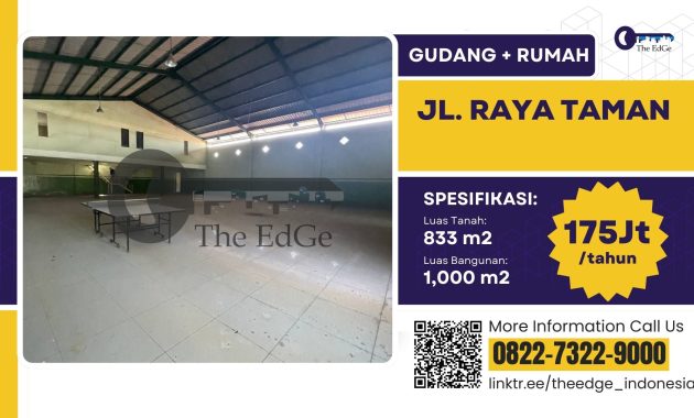 BANYAK PILIHAN GUDANG AREA :Sidoarjo : Taman, Gedangan, Buduran,Tambak SawahSurabaya : Rungkut Industri SIER, Margomulyo, BenowoGresik : Menganti, Romokalisari, KIG, Driyorejo, KebomasMojokerto : By Pass Krian, NgoroPasuruan : Gempol Luas Bangunan Mulai 1.000 m2 – 60.000 Spesifikasi :Luas Tanah 833 m2Luas Bangunan 1000 m22 LantaiKantorAir SumurHadap SelatanListrik Toke 5500 Watt Harga Sewa 175 Juta / […]