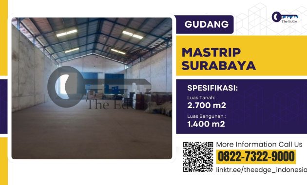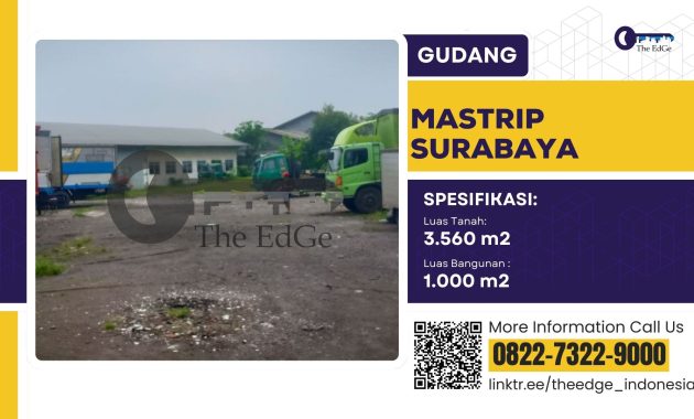 BANYAK PILIHAN GUDANG AREA :Sidoarjo : Taman, Gedangan, Buduran,Tambak SawahSurabaya : Rungkut Industri SIER, Margomulyo, BenowoGresik : Menganti, Romokalisari, KIG, Driyorejo, KebomasMojokerto : By Pass Krian, Ngoro Pasuruan : Gempol Jual Gudang Karang Paling Mastrip Warugunung SurabayaLuas Tanah 3.560 m2Luas bangunan 1.000 m2Harga 6.5 Milyar / Tahun 8 Manfaat menggunakan Jasa The EdGe :