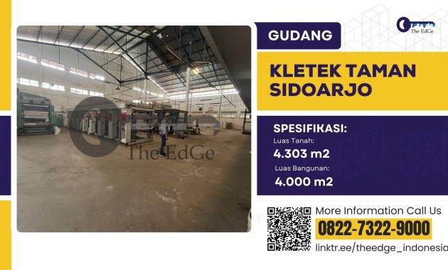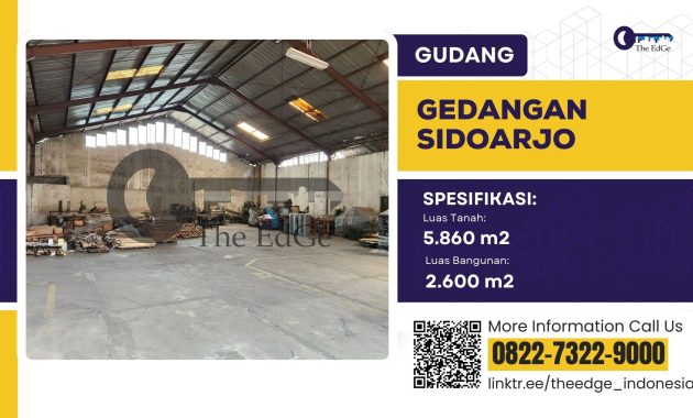 JUAL GUDANG RAYA TAMAN SIDOARJOSpesifikasi :Luas tanah : 4.303 m2Luas bangunan : 4.000 m2PLN : 160.000 wattAir : sumurSurat : SHMHadap : selatanHarga 30 M ( Nego) 8 Manfaat menggunakan Jasa The EdGe :